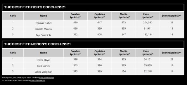 与世界足球先生评选不同,世界足球小姐的得主普特利亚斯,以碾压性的优势获得了这一奖项,她在4个投票主体中的得分都高于主要竞争者,拿到了52分(4个13分)的满分。同样满分当选的,还有男足最佳教练图赫尔。根据相应的规则,在最佳教练的评选中,候选人在每个投票主体的选票将依次被换算为7分、5分、3分、2分、1分,图赫尔最终则拿到了28分(4个7分)。年度女足最佳教练,切尔西主帅海耶斯相较第二名,巴萨主帅科尔特斯的优势不大。从最终的得分来看,海耶斯最终赢在了队长投票这一项。