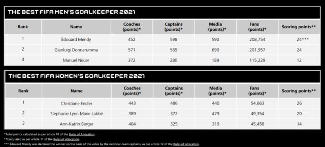 最佳门将评选方面,爱德华·门迪与唐纳鲁马经过计算后的总分都是24分。这样的结果也表明,两人在4个投票主体中分别拿到两个第一和两个第二。根据相应规则,当出现平分时,应当以和对应奖项相关度最强的投票主体的投票结果为准。若最佳门将的评选出现平分情况,则以国家队队长的投票排定次序。因此在队长评分中以598比565险胜唐纳鲁马的门迪,